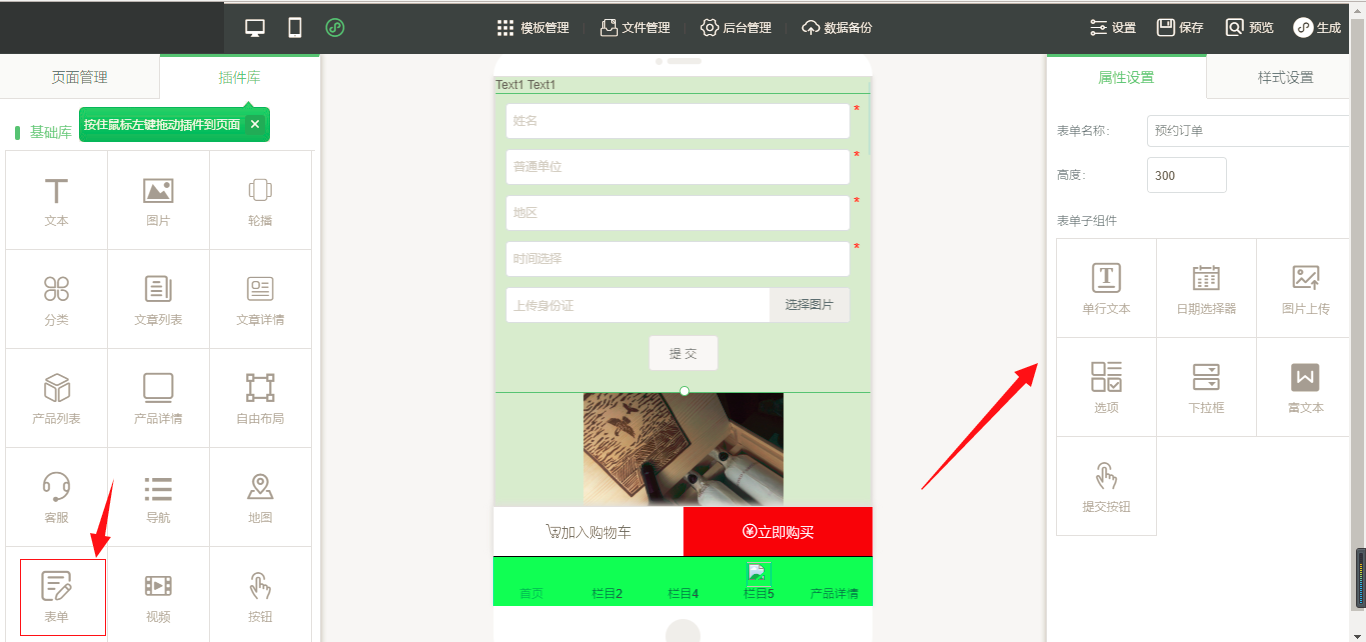 1.在小程序编辑器中,拖入表单插件,选择所需要的表单子组件,拖入到页面中,选择完毕之后,点击“保存”,如图所示: